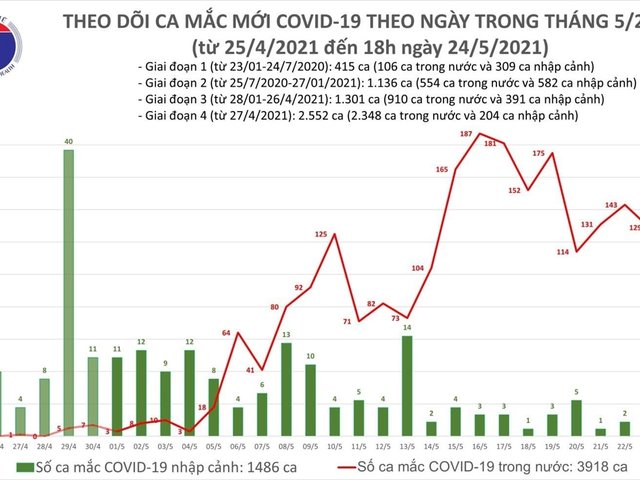 Chiều 24/5, theo thống kê của Bộ Y tế, Việt Nam ghi nhận 96 ca mắc COVID-19 mới, trong đó 1 ca được cách ly ngay, 95 ca lây lan trong cộng đồng.