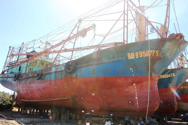 5 con tàu 67 của ngư dân Bình Định đóng thép Trung Quốc do Công ty TNHH Đại Nguyên Dương đóng bị rỉ sét, hư hỏng nặng nề đã được lên đà chờ sửa chữa.
