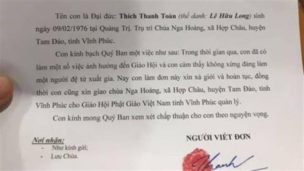 Chiều 5/10, sư Thích Thanh Toàn, trụ trì chùa Nga Hoàng ở Tam Đảo gửi đơn đến Giáo hội Phật giáo tỉnh xin xả giới và hoàn tục.