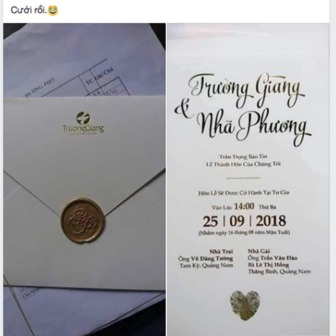 Bức ảnh về tấm thiệp cưới của cặp đôi Trường Giang - Nhã Phương đang được lan truyền rộng rãi trên khắp các trang mạng xã hội và nhận được sự quan tâm của nhiều người hâm mộ.