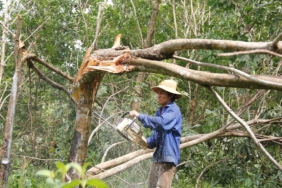 Người dân ứa nước mắt cưa vườn cao su đổ gãy sau bão số 10