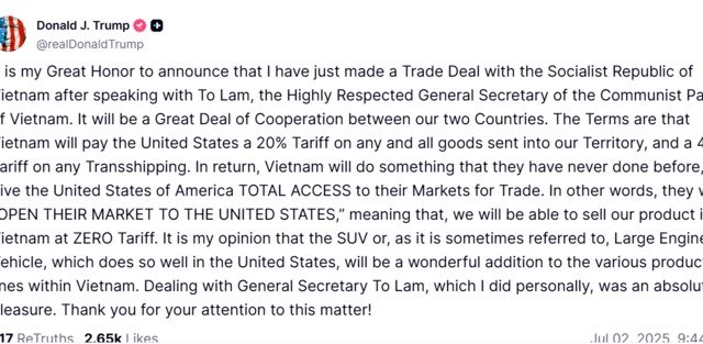 Tổng thống Trump thông báo Mỹ đạt thỏa thuận thương mại với Việt Nam