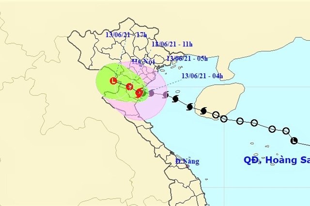 Sáng sớm nay (13/6), bão số 2 giật cấp 10, vị trí tâm bão ở trên khu vực đất liền ven biển từ Thái Bình đến phía Bắc Nghệ An.