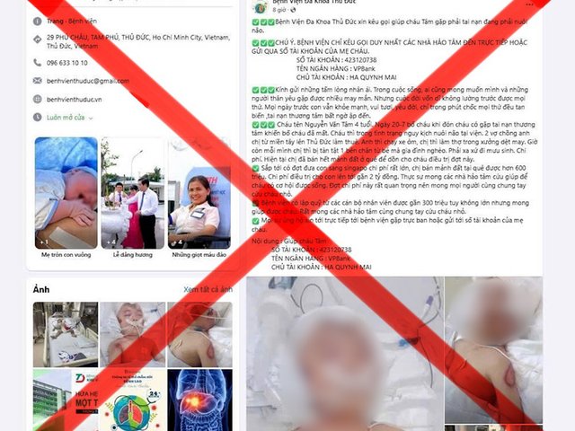 Đối tượng lạ giả mạo fanpage của Bệnh viện Đa khoa Thủ Đức, TP.HCM kèm theo hình ảnh bệnh nhi nguy kịch để kêu gọi quyên góp từ thiện.