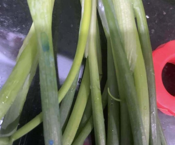Khi rửa hành, nếu thấy lớp bột hoặc giọt thuốc màu xanh da trời còn bám thì có thể hành vừa được phun thuốc bảo vệ thực vật, chưa kịp phân hủy.