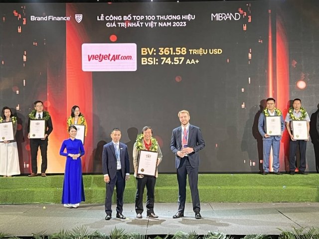Vietjet được vinh danh là 1 trong 100 thương hiệu giá trị nhất Việt Nam năm 2023 tại lễ công bố Top 100 thương hiệu giá trị nhất Việt Nam do Brand Finance tổ chức.