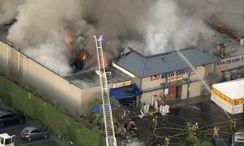 Lực lượng cứu hỏa quận Cam mất hơn một giờ để kiểm soát đám cháy lớn tại khuôn viên thương xá Phước Lộc Thọ.