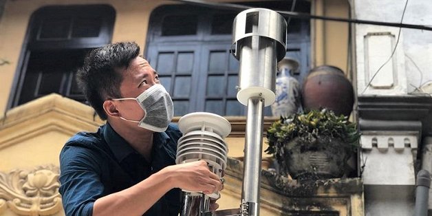 Các kỹ sư của Chi cục Bảo vệ môi trường đang đo chất lượng không khí tại khu vực phường Hạ Đình Hà Nội sau vụ cháy ở Công ty bóng đèn phích nước Rạng Đông.