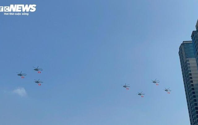 Cận cảnh trực thăng kéo cờ, tiêm kích Su30-MK2 thả nhiễu trên bầu trời TP.HCM