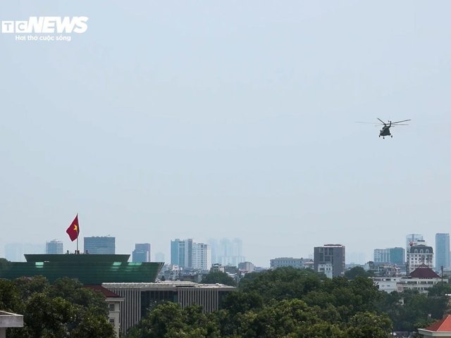Chiều 30/7, máy bay trực thăng và tiêm kích Su-30MK2 bay khảo sát tại Quảng trường Ba Đình, chuẩn bị cho dịp đại lễ 2/9.