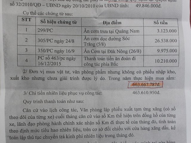 Việc chi sai số tiền khủng trên 13,8 tỉ đồng đều được lãnh đạo, kế toán ký duyệt chi. Trong đó có số tiền hợp thức hóa để lãnh đạo đi công tác và chi tiếp khách sai ở 61 tỉnh thành và 17 huyện, thành phố trong tỉnh Gia Lai.