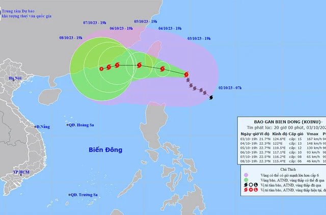 Lúc 19h ngày 3/10, bão Koinu giật trên cấp 17 cách đảo Đài Loan (Trung Quốc) khoảng 410 km về phía Đông Đông Nam và đang tiến gần Biển Đông.