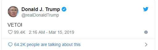 Sau khi Thượng viện Mỹ thông qua dự luật chấm dứt tuyên bố tình trạng khẩn cấp quốc gia của Tổng thống Trump, nhà lãnh đạo Mỹ lập tức cảnh báo đanh thép.