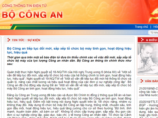 Cổng thông tin điện tử Bộ Công an đăng tải thông tin chính thức về việc Bộ Công an tiếp tục đổi mới, sắp xếp tổ chức bộ máy tinh gọn, hoạt động hiệu lực, hiệu quả.