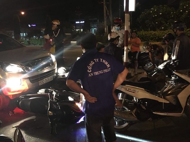 Chiếc xe Toyota tông vào một ô tô khác dừng đèn đỏ, xô chiếc xe này tông liên tiếp vào nhiều xe máy đang dừng phía trước.