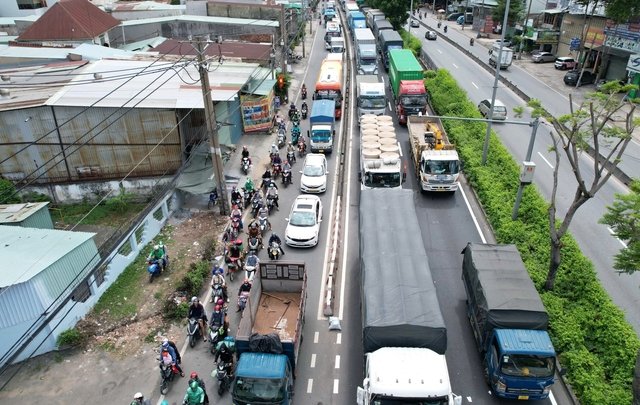 Xe tải tông nhau lật ngang trên đường, giao thông ùn tắc kéo dài 2km tại TP.HCM