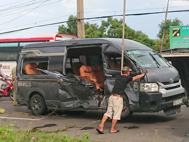 Chạy trên đường Ven Biển, ôtô chở công nhân đi du lịch xảy ra tai nạn với xe 16 chỗ đang băng qua ngã tư khiến 8 người bị thương.