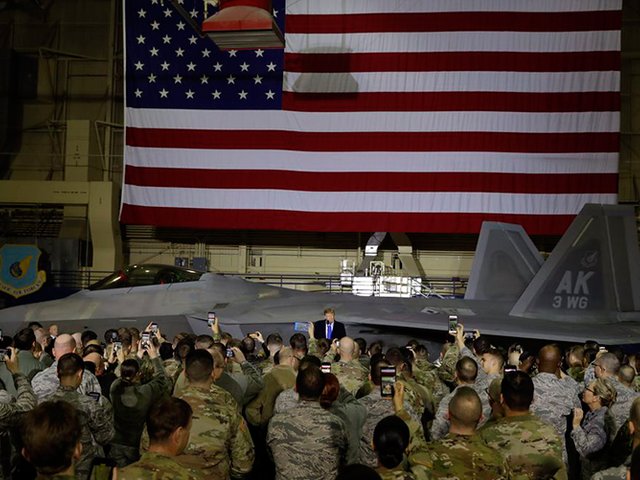 Tổng thống Trump có cuộc gặp mặt ngắn với các binh sĩ tại một căn cứ Không quân Mỹ trên đường từ Hà Nội trở về Washington.