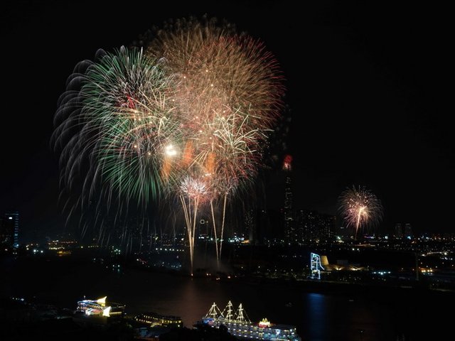 Đúng 21 giờ tối 30.4, pháo hoa rực sáng trên bầu trời TP.HCM. Trước đó, hàng ngàn người từ khắp nơi đổ về khu vực trung tâm TP để vui chơi và chờ màn bắn pháo hoa mừng kỷ niệm 44 năm thống nhất đất nước.