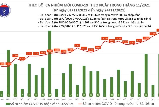 Chiều 24/11, Bộ Y tế công bố thêm 11.811 ca COVID-19, trong đó 11.789 ca ghi nhận trong nước.