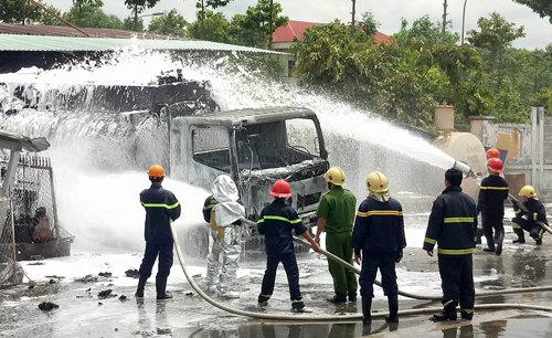 Cảnh sát cứu hỏa phải dùng hóa chất chuyên dụng để dập lửa từ hai xe bồn chở nhiên liệu, cứu cửa hàng xăng dầu ở huyện Xuân Lộc.