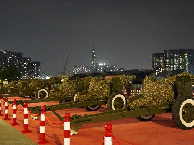 Lực lượng quân đội xuyên đêm lắp đặt 15 khẩu pháo bên Bến Bạch Đằng, chuẩn bị cho lễ bắn đại bác chào mừng 50 năm Ngày Giải phóng miền Nam.