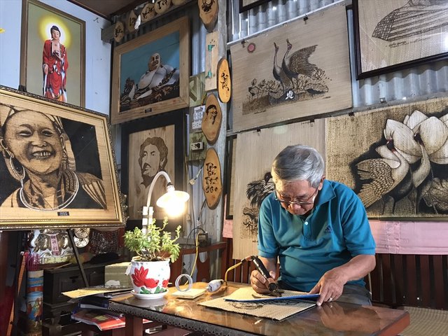 Một lần thấy bạn mình vẽ tranh trên chất liệu lạ, họa sĩ Võ Minh Mẫn đã nảy ra ý tưởng vẽ tranh bằng bút lửa trên chất liệu chiếu. Từ đó, liên tiếp những tác phẩm độc đáo của ông được ra đời.
