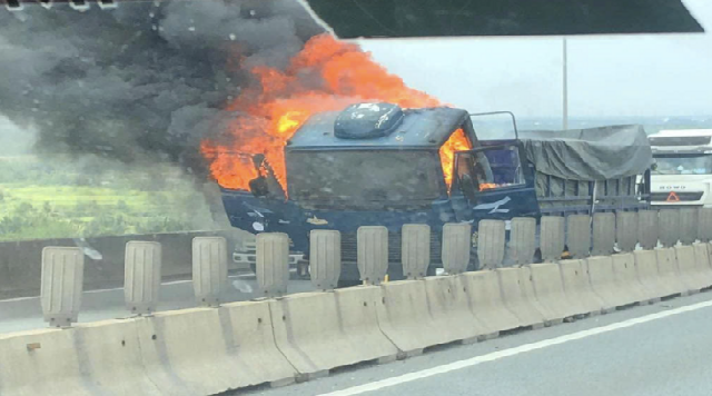Vụ hỏa hoạn xảy ra giữa trưa khiến phần đầu và thùng xe bị thiêu rụi, giao thông qua cầu Long Thành bị tê liệt cục bộ khoảng 5km.