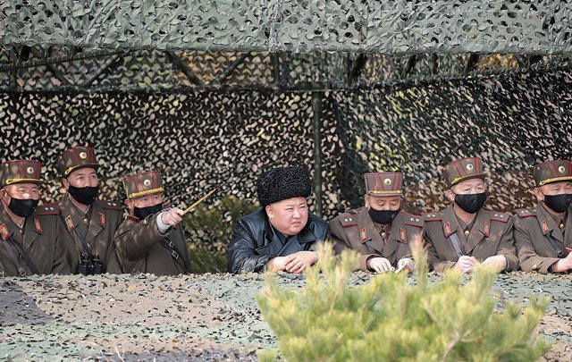 Lãnh đạo Triều Tiên là người duy nhất không đeo khẩu trang tại sở chỉ huy khi giám sát cuộc tập trận chớp nhoáng của nhiều đơn vị pháo binh.