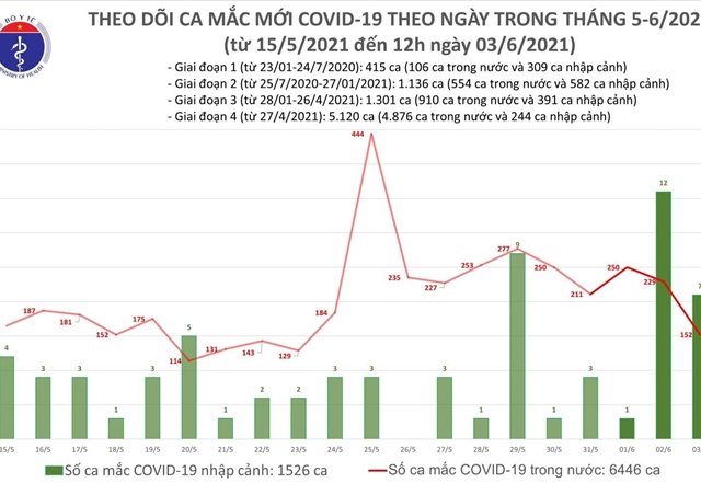 Trưa 3/6, theo thống kê của Bộ Y tế, Việt Nam ghi nhận thêm 102 người mắc COVID-19, trong đó 6 ca được cách ly ngay, 96 ca lây lan trong cộng đồng.