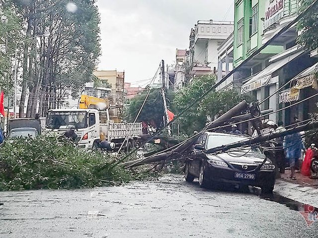 Trụ điện gãy đè ô tô biển xanh của Bí thư Thành uỷ ở Hậu Giang