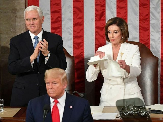 Ngay sau khi Tổng thống Trump kết thúc bài phát biểu Thông điệp Liên bang tại khán phòng Hạ viện Mỹ đêm 4/2 (theo giờ địa phương), trong lúc các nghị sĩ đảng Cộng hòa vỗ tay tán thưởng nhà lãnh đạo, Chủ tịch Hạ viện Nancy Pelosi của đảng Dân chủ đã thẳng tay xé đôi bản sao Thông điệp Liên bang ngay sau lưng ông Trump.