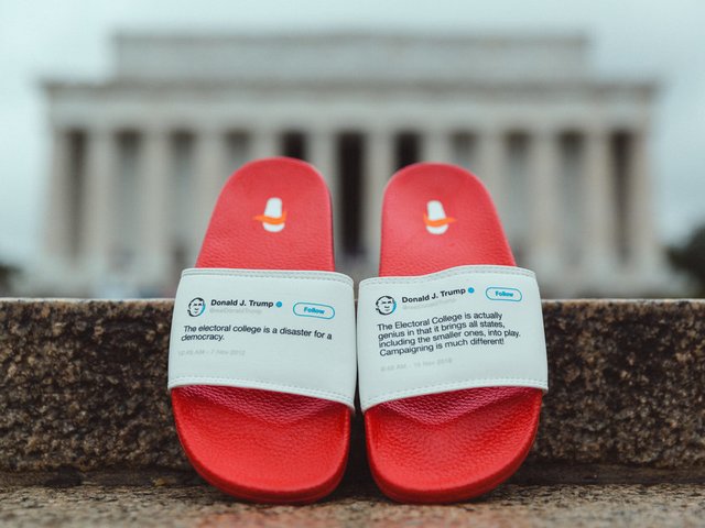 Một nghệ sĩ nhiếp ảnh đã có ý tưởng in các dòng Twitter của Tổng thống Donald Trump lên dép, nhờ đó mà ông đã kiếm được hàng triệu đô.