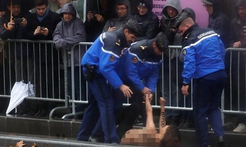 Cảnh sát Pháp bắt một phụ nữ để ngực trần tìm cách ngăn chặn đoàn xe của Tổng thống Mỹ tham dự lễ tưởng niệm ở Paris.