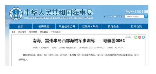 Thông báo Cục Hải sự Trung Quốc đăng tải hôm 31/3 cho biết, quân đội nước này sẽ tập trận ở phía tây bán đảo Lôi Châu của Trung Quốc, tức vịnh Bắc bộ từ ngày 1-30/4.