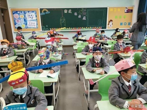 Học sinh Trung Quốc đội "mũ giãn cách"