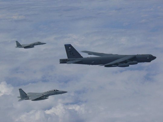 Lực lượng Không quân Mỹ ở Thái Bình Dương cho biết hai máy bay ném bom B-52 của Mỹ hôm 16-10 bay gần các khu vực tranh chấp ở biển Đông.