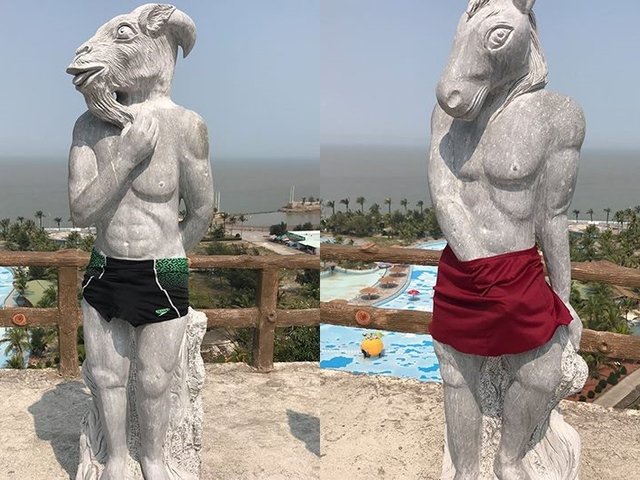 Thay vì sử dụng đồ bơi để che chắn những bộ phận "nhạy cảm", tượng 12 con giáp ở Hải Phòng đã chuyển sang sử dụng lá cây, quả nhựa.