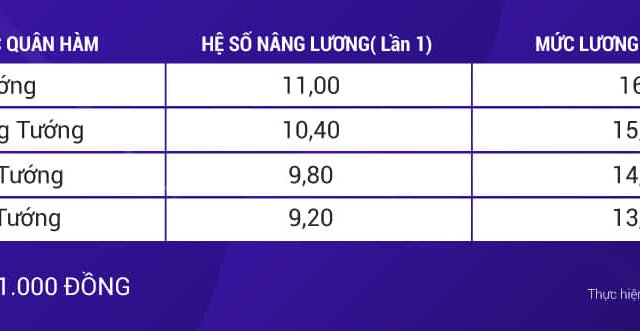 Đại tướng quân đội và công an sau khi được nâng lương có hệ số 11,00 với mức lương 16,39 triệu, chỉ thấp hơn lương của Chủ tịch nước, Chủ tịch QH, Thủ tướng và Phó Chủ tịch nước.