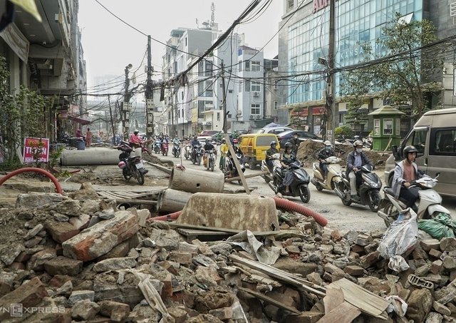 Dự án cải tạo, mở rộng phố Vũ Trọng Phụng (quận Thanh Xuân) dự kiến hoàn thành cuối năm 2019 nhưng đến nay vẫn ngổn ngang gạch đá.