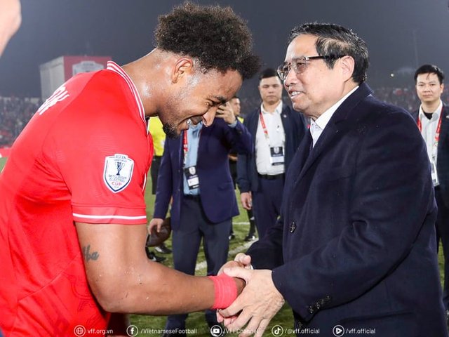 Thủ tướng Phạm Minh Chính dự khán và xuống sân chúc mừng đội tuyển Việt Nam giành chiến thắng trước Thái Lan ở chung kết lượt đi AFF Cup 2024.