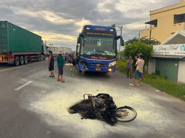 Sau cú va chạm với ô tô khách, xe máy văng ra xa rồi bốc cháy dữ dội, 2 người đàn ông trên xe tử vong tại chỗ.