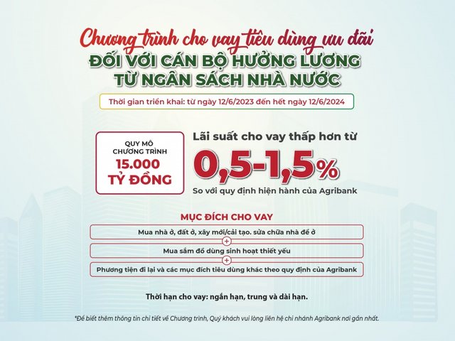 Với mong muốn đem lại giải pháp tài chính dành cho khách hàng phục vụ nhu cầu đời sống, Agribank triển khai Chương trình cho vay tiêu dùng ưu đãi đối với cán bộ, công chức, viên chức và người lao động đang hưởng lương từ ngân sách nhà nước với tổng nguồn vốn cho vay lên đến 15.000 tỷ đồng.
