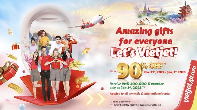 Nhân dịp năm mới 2023, hãng hàng không Vietjet lì xì hàng trăm ngàn mã giảm đến 90% giá vé, cùng E-voucher 300.000 đồng dành cho hành khách.