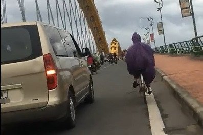 Ôtô đi chậm chắn gió giúp người phụ nữ đạp xe qua cầu ở Đà Nẵng
