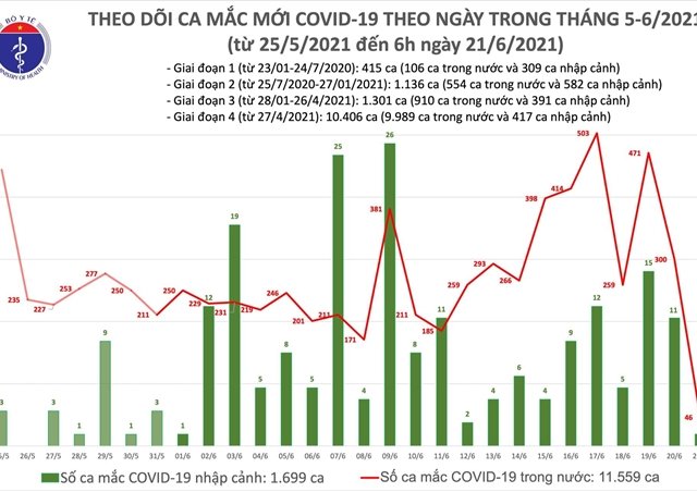Sáng 21/6, theo thống kê của Bộ Y tế, Việt Nam thêm 47 ca mắc COVID-19, trong đó 1 ca được cách ly ngay và 46 trường hợp ghi nhận trong nước.