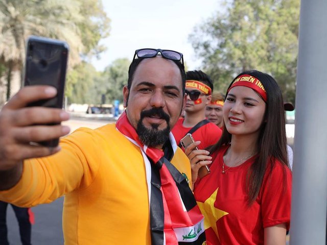 Hàng trăm CĐV Việt Nam ùn ùn kéo tới SVĐ Mohammed Bin Zayed tiếp lửa tuyển Việt Nam đấu Iraq trong trận ra quân Asian Cup 2019.