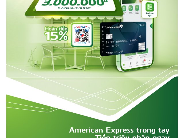 Vietcombank triển khai chương trình khuyến mại “American Express trong tay – Tiền triệu nhận ngay” từ ngày 21/10/2022 đến hết ngày 31/12/2022. Với tổng ngân sách trả thưởng lên tới 3 tỷ đồng, hàng ngàn phần quà sẽ được gửi tới khách hàng tham gia chương trình.