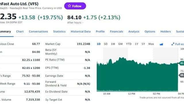 Kết thúc phiên giao dịch 25/8 trên sàn Nasdaq, cổ phiếu VFS của VinFast đóng cửa với mức giá 68,77 USD/cp, tăng hơn 40% so với phiên giao dịch trước.