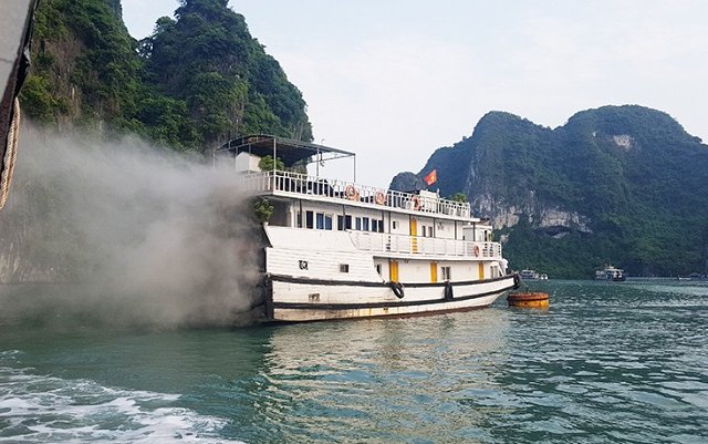 Một tàu du lịch lưu trú trên vịnh Hạ Long bỗng nhiên bốc cháy trong khi khách du lịch đang tham quan hang Sửng Sốt nên không có thiệt hại về người.